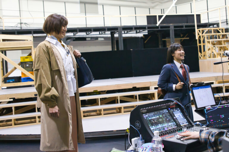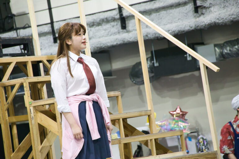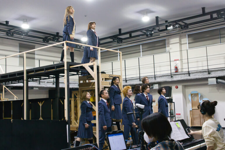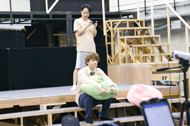 衣裳やウィッグをまとい制服姿のキャストが稽古場に増えていくと、稽古場はさながら学校の体育館のよう。柔軟をしたり、振付の確認をしたり、衣裳姿で写真を撮りあったり。適度な緊張感の中にも、どこかほのぼのとした明るさが漂う。まるで学校の文化祭前のような、あのワクワクする空気が稽古場を満たしていた。
