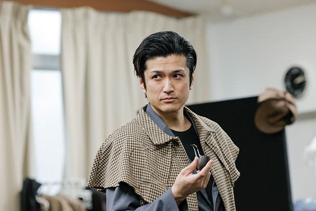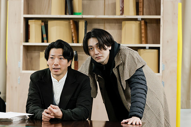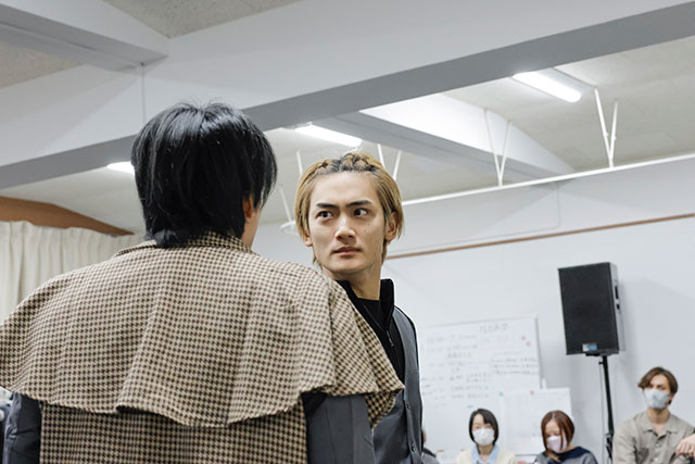 ソン・ジェジュンが演出卓から見守る中、まずはドイル役の加藤和樹、ホームズ役の渡辺大輔のペアから公開稽古がスタート。休憩中から小道具を手に持ってセリフを確認していた加藤と、リラックスしながらホームズのコートを羽織り、ゆっくりと役に入っていた渡辺の対比が面白い。