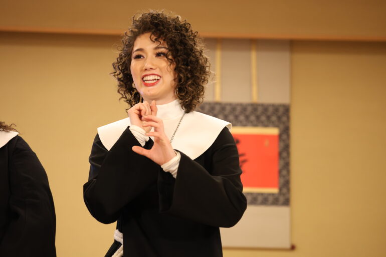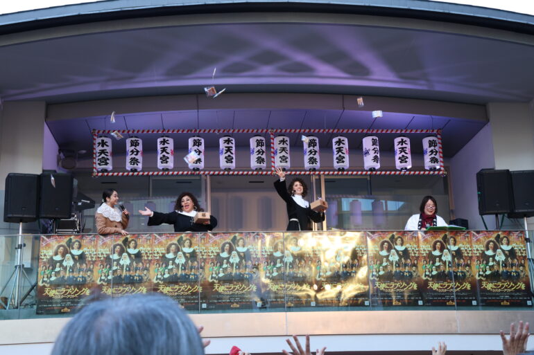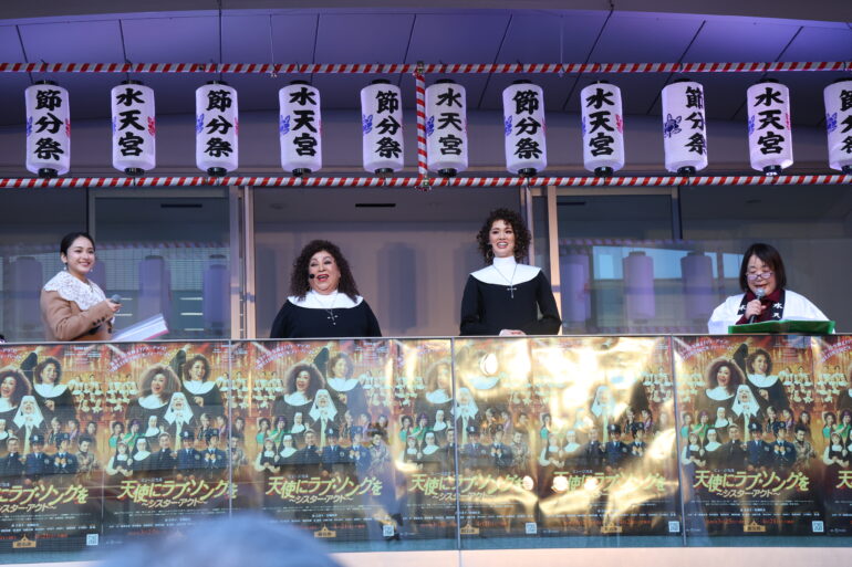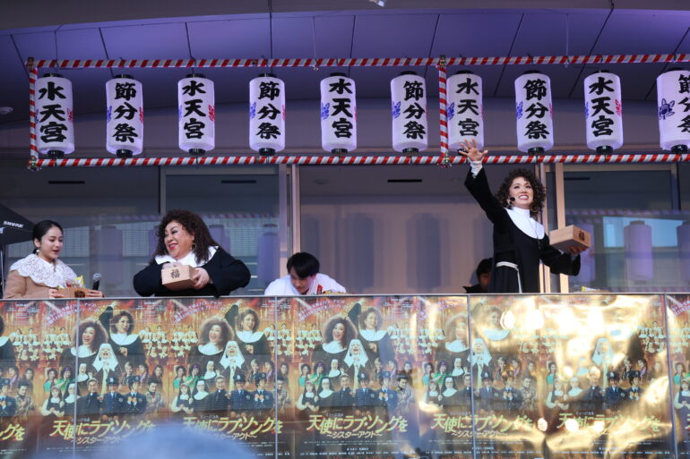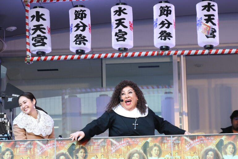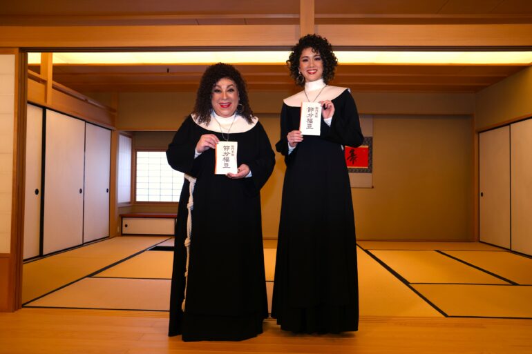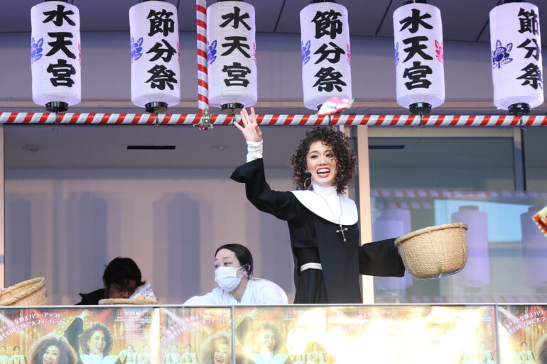 本公演でWキャストで主演を務める森 公美子と彩風咲奈が、2026年2月3日(火)に水天宮で開催された「節分祭」の豆まきイベントに特別ゲストとして参加。アフロヘア&修道服という舞台扮装姿で豆まきに降臨した。