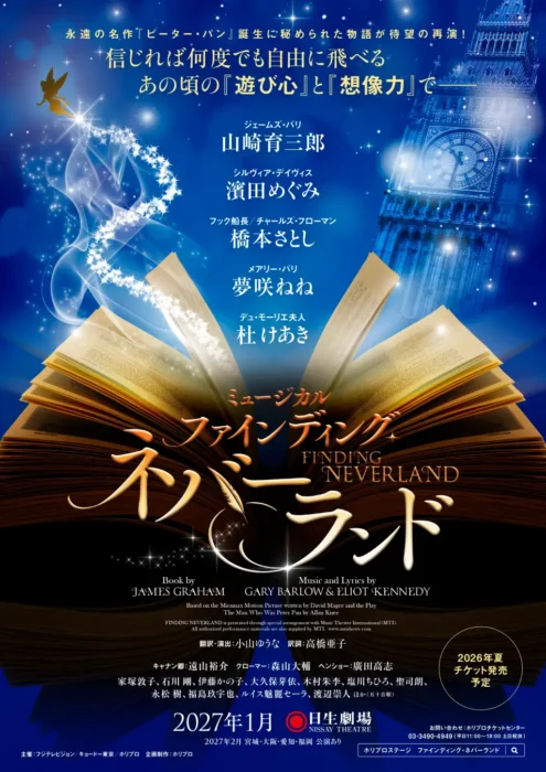 永遠の名作『ピーター・パン』誕生に秘められた物語が待望の再演!2023年に小山ゆうな演出・山崎育三郎主演で上演され大好評を得た、ミュージカル『ファインディング・ネバーランド』が2027年1月に日生劇場にて待望の再演決定!さらに、濱田めぐみ、橋本さとし、夢咲ねね、杜けあきの出演も決定。2月には宮城・大阪・愛知・福岡にてツアー公演の上演も決定している。