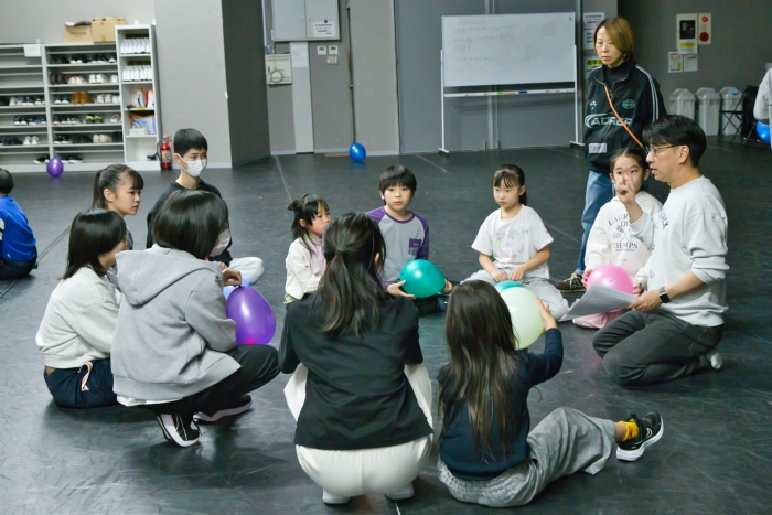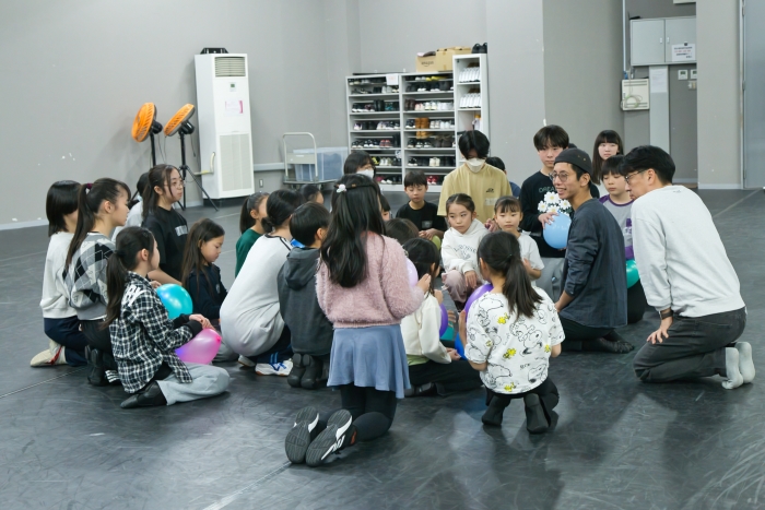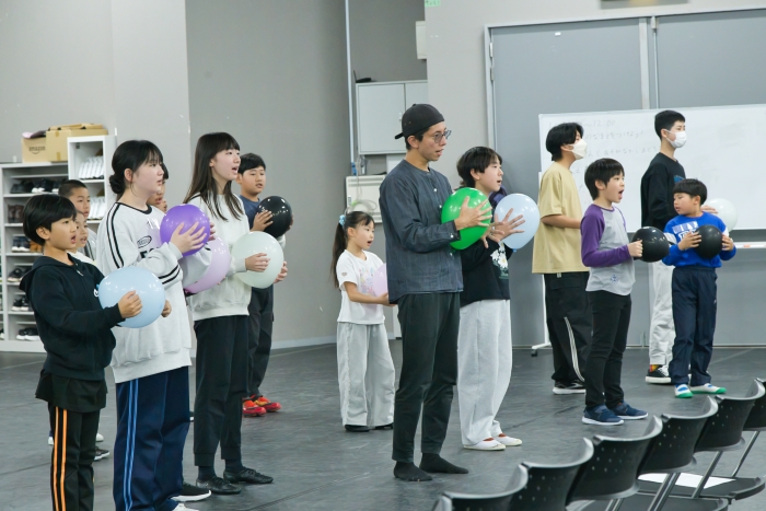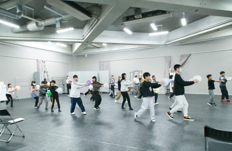 美木は風船を用いた振付を考案。今回の参加者は小学1年生から中学3年生までと年齢にバラツキがあり、ダンス経験者もいれば未経験者も参加している。「幅広い世代の子どもたちがいるからこそ、難しい振付を覚えるよりも、アイテムと共に動く中で表現を学ぶ方が、このワークショップには適していると考えた」と、美木は語る。この狙いは見事にハマっていたように思う。「風船を大切なものだと思って動かしてね」。美木の声掛けで、すでに表現力が培われている年上組の参加者はもちろん、小学校低学年の子たちの動きにも、はっきりとした変化が表れていった。また、小道具を大切に扱うという舞台人として欠かせない意識も、自然と共有されていったように感じられた。