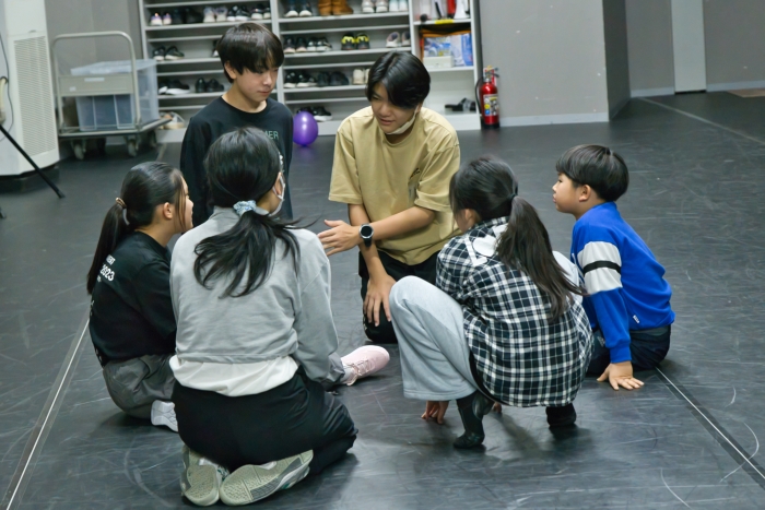 歌と振付の指導が進み、次第に全体像が浮かび上がってくる。その中で、講師の2人が熱心に繰り返し伝えていたのは、「その表現を通じて誰に何を伝えたいのか?」ということ。歌を担当するカサノボーは、歌詞に度々出てくる「君」の存在を意識させると同時に、歌を身近なところに落とすのではなく、稽古場の壁の向こう側へ届けるよう身体全体を使って伝える。子どもたちは新しい振付が増えるとダンスに意識が向いてしまい、歌に気が回らなくなってしまうことも。すると、すかさずカサノボーが「壁の先、もっと遠くを見てみよう!」と声をかける。序盤の発声練習や歌唱練習を通して、子どもたちはすでに声を前に届ける感覚を身につけていた。カサノボーのひと声をきっかけに、少し前に学んだその感覚が呼び起こされたのか、歌声と表現が見違えるように変化していく。