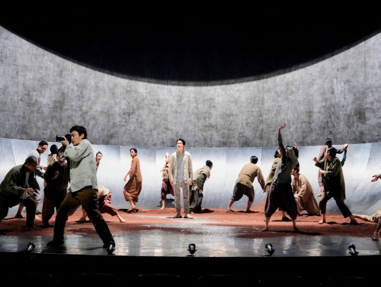 この舞台では、無機質で殺伐とした空間で悩む男を据えた “現代”の場面が随所にインサートされ、古代インドの物語が今の世界の様相と接続されていく。この“現代パート”では、世界の経済、紛争、ニュースの音声、スポーツの熱狂、ロケットの発射音、空港のざわめきなど、混沌とした音のコラージュが鳴り響く。彼に静かに話しかける青年の名前はデーミアン……このパートには同じくヘッセの小説「デーミアン」が重ねられ、ヘッセが同じ頃に執筆した両作が融合していくのも面白い趣向。