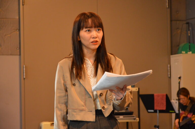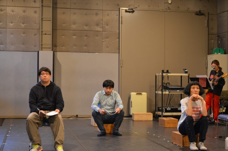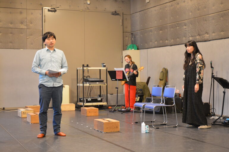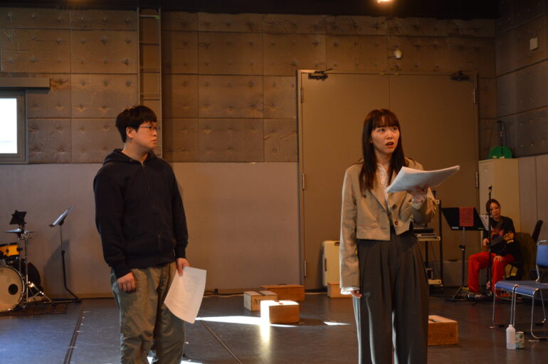 コードが書き込まれた楽譜とセリフが書き込まれた台本。双方を交互に照合しながら稽古が進められる。これもまたヌトミックと東京塩麹と、演劇と音楽を横断した活躍を見せる額田ならではの稽古の在り方である。額田は、第33回読売演劇大賞中間選考会にて、滋企画『ガラスの動物園』で作品賞・演出家賞としてベスト5にも選出されたばかり。本作を通じて、日本語音楽劇の新たな地平を展望する。