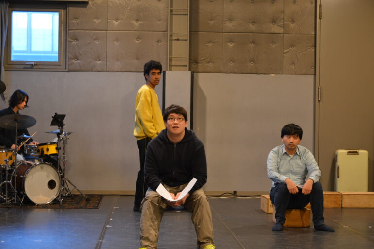 それによると、バンドの立ち位置は俳優のそれよりさらにもう少し高くなるらしい。そう聞いて、時折椅子から降り、地べたに座って稽古を見てみた。「見る」ではなく、「見上げる」。それだけで目の前の風景の印象はガラリと変わる。ここでの名言は避けたいが、この音楽劇において、その構図はとても大きな意味を持っている。