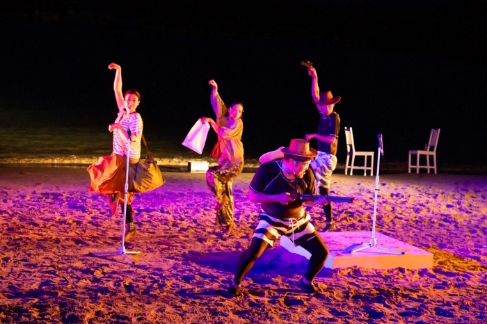今年、9月19日(金)からの3日間、兵庫県・豊岡市の竹野浜 特設ステージにて上演された、スリーピルバーグス第3回野外公演inビーチ!『歌唱劇 パラダイスをくちずさむ』(作・演出:福原充則、音楽:益田トッシュ)。本物の野球場で上演され、話題を呼んだ野外劇『リバーサイド名球会』から早1年、スリーピルバーグスが二度目となる豊岡演劇祭2025 ディレクターズプログラムで選んだ場所はシーサイド。読んで字の如く竹野浜の海辺、見渡す限りに広がる空と海の間で繰り広げられる歌唱劇である。