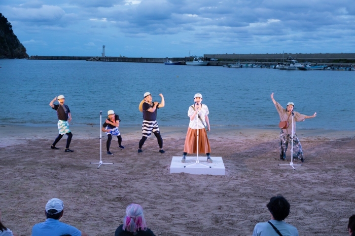 ホテルからレンタカーを走らせること約30分。うねる山道の果てにその海はあった。開演は18時、上演時間は60分。そんな限られた公演に無事立ち会えそうなことにまず胸を撫で下ろす。念願の豊岡演劇祭、念願のスリーピルバーグスである。運転中はどんよりと立ちこめていた雲が徐々に散り、遠くの方がうっすらとオレンジがかっていた。そんなこの上ない美術を背景に『歌唱劇 パラダイスをくちずさむ』は開幕した。
