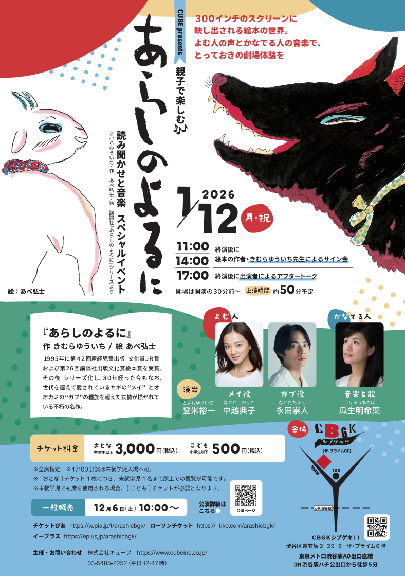 絵本『あらしのよるに』の読み聞かせと⾳楽を組み合わせた親⼦で楽しめるスペシャルイベントが、2026年1月12日(月祝)に開催される。人気絵本シリーズ「あらしのよるに」は、ヤギの”メイ”とオオカミの”ガブ”の種族を超えた友情が描かれている不朽の名作で、これまでもアニメ化されたり、何度も舞台化されたりと、様々な形で幅広い世代に愛されてきた。今回は、300インチのスクリーンに映し出した絵本の世界を、メイ役の中越典⼦とガブ役の永⽥崇⼈による読み聞かせと、⽠⽣明希葉の⾳楽と歌で彩るイベントとして観客に届ける。出演者の3人に、本作へ挑む思いを聞いた。