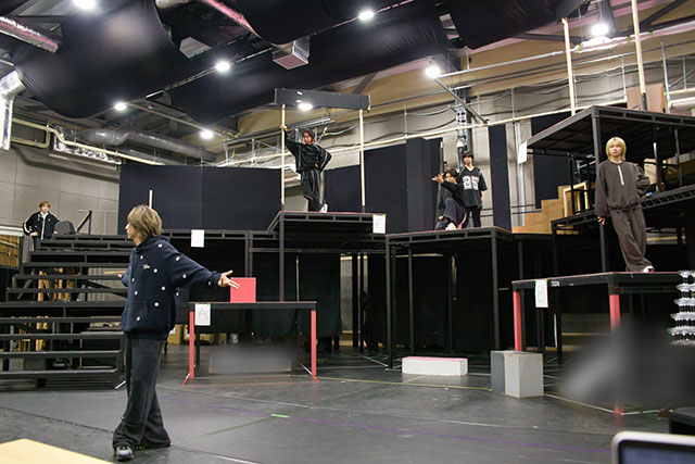 稽古場には、本シリーズではお馴染みのキャットタワーをイメージした高さのあるセットが組み上げられていて、この日はセットが組まれての初めての稽古が行われた。動線はスムーズか、想定外の部分はないか。序盤のシーンから順に、お互いの距離感や立ち位置などを、植田の号令のもと確認していく。まずはおなじみの【Clubキャッテリア】や【Club ギャラクシーMAO】といった猫のホストたちがお目見え。