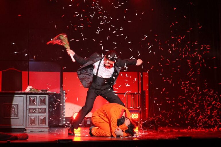 まずは『熱海殺人事件』をおさらいしておこう。本作の主人公は警視庁に名を馳せる木村伝兵衛(荒井敦史)。彼は愛人かつ部下の水野朋子(大原優乃)、そして富山県警からやってきた熊田留吉(高橋龍輝)とともに、熱海の海岸で起きた殺人事件を捜査する。最初から犯人は、被害者の同郷の幼馴染で職工として働く大山金太郎(横田大雅)だと分かっている。しかし、伝兵衛はこの事件の全貌に満足せず、不条理な問答を畳み掛けながら、大山を立派な犯人になるよう、導いていく……という物語。