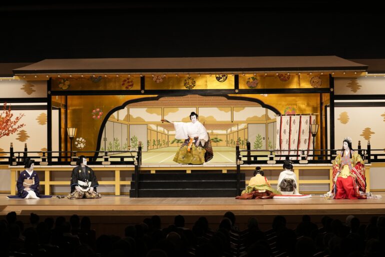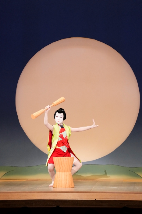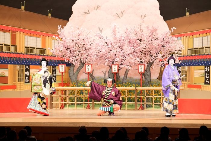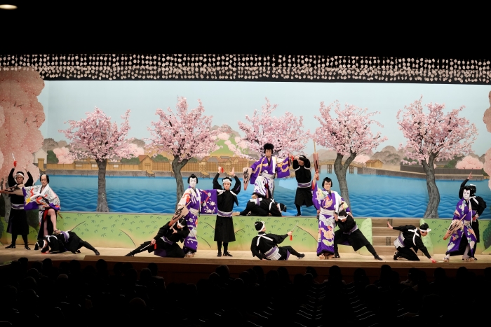 昼の部の幕開けを飾ったのは『醍醐の花見』。ご当地・京都は醍醐寺で豊臣秀吉が催した一世一代の宴を題材とした演目。中村鴈治郎演じる豊臣秀吉、中村扇雀演じる北の政所をはじめとした一同が、桜を愛でながら次々に舞い踊る。歴史上の人物たちが居並び、満開の桜が咲き誇る舞台に、会場は華やかな雰囲気に包まれた。