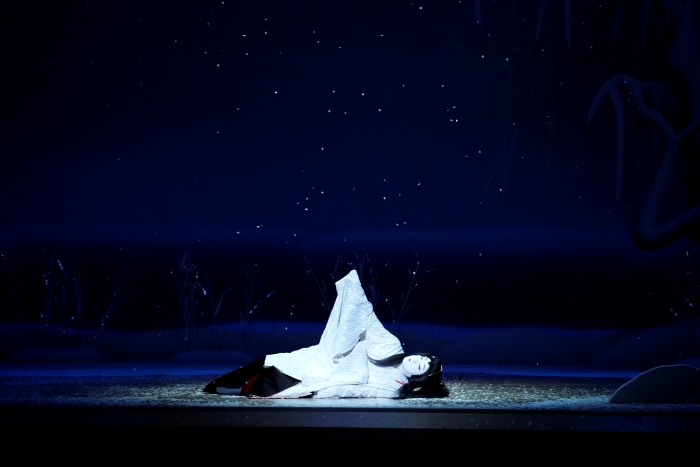 続いては、尾上菊之助の襲名披露狂言となる『玉兎』。大きな月の中から杵を携えて現れた兎は、「かちかち山」を題材に、狸や老爺、老婆など、さまざまな人物を踊り分ける。菊之助の可愛いらしい兎の踊り姿に、客席も和やかな雰囲気に包まれた。続く『鷺娘』は八代目尾上菊五郎の襲名披露狂言。一転して銀世界の厳かな雰囲気の中、白無垢姿で現れた菊五郎扮する鷺の精は、恋の苦楽を踊る。やがて激しい雪の中、恋の責め苦に苛まれ妄執を見せる姿に、会場全体が圧倒され、惜しみない拍手が送られた。